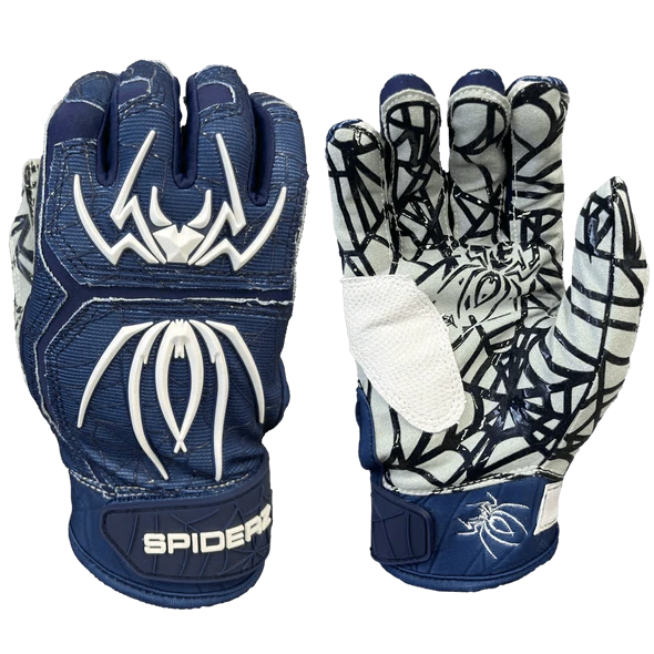 These 2023 Spiderz HYBRID Batting Gloves: Navy/Gold models are available from Youth Medium to Adult 2XL and ships fast and free right here at headbangersports.com! Â