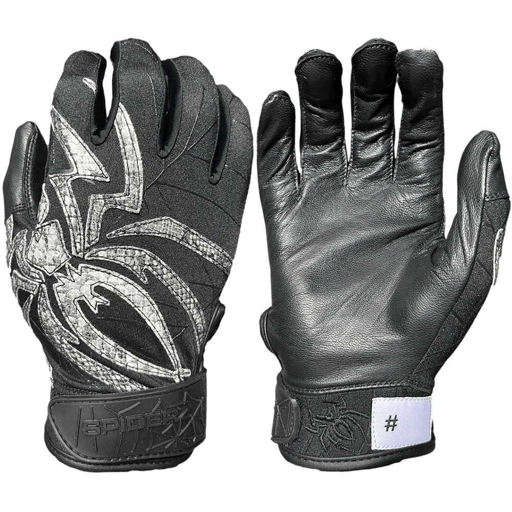 LIMITED EDITION “Black Mamba” PRIZM model. The Black Mamba features a smooth & soft black leather palm, flexible polyester top hand fit, triple reinforced wrist strap and our Spiderz logo in a faux snake skin material.